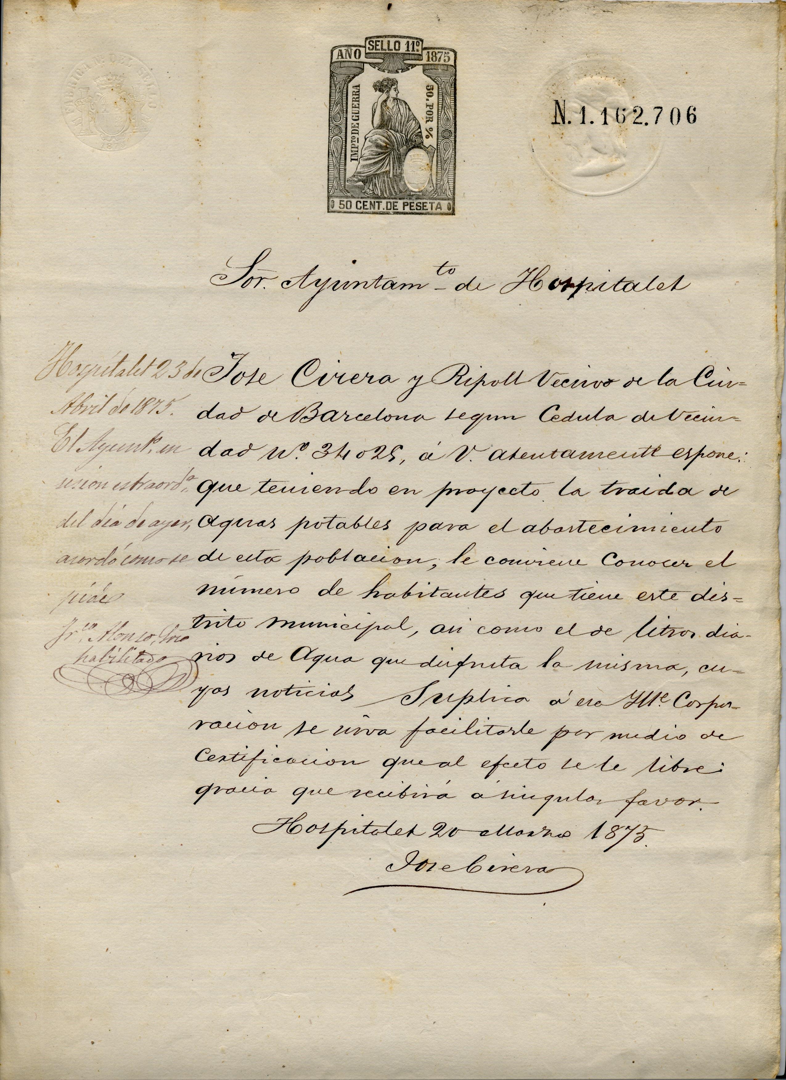 Expedient de sol·licitud d'informació demogràfica efectuada per José Cirera i Ripoll en relació al projecte d'abastiment d'aigua potable a L'Hospitalet